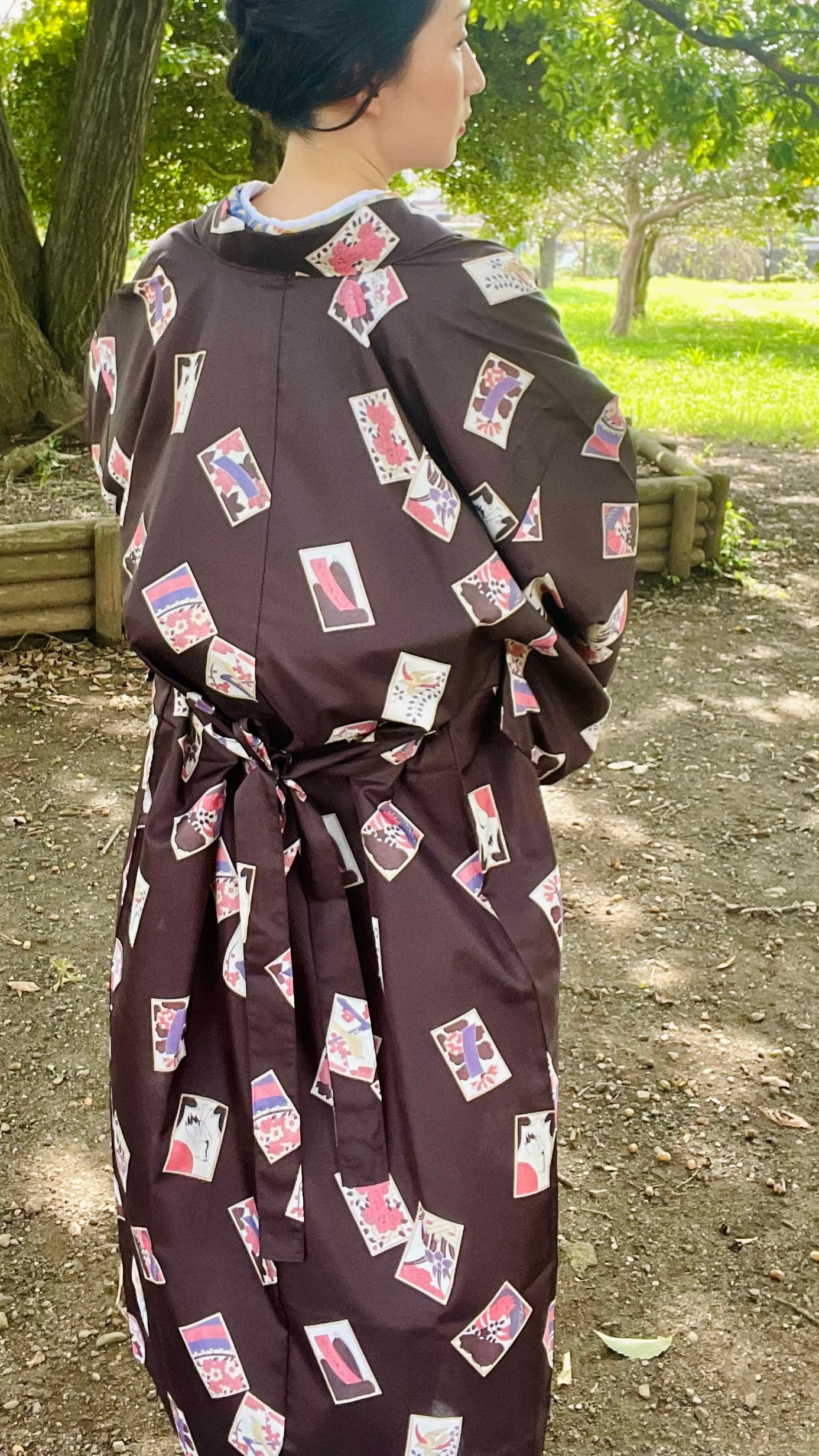 花札柄ってカッコよくって、長年探してたんです。花札好きの方なら伝わると思うんですが、控えめな柄行なんです。控えめなのって珍しい。控えめだから羽織として着やすい。真っ黒でなく、焦茶だから、コントラスト控えめでより着やすい。